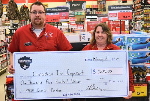 The Kincardine Adult Soccer Association (KASA) has donated $1,500 to the Kincardine Canadian Tire Jumpstart program.