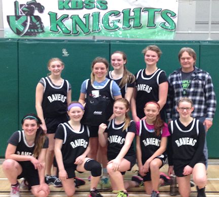 The Ripley Ravens girls basketball team includes, back, Aysha Machan (L), Madison Beishuizen, Ashley Uzzell, Serena Rutledge, coach Dave Quinn; and in front, Ivy Farrell (L), Larissa Chalmers, Maddy Gallant, Desirae MacLennan, and Becky Blanchard; absent, is Emma Twolan; photo courtesy of Dave Quinn