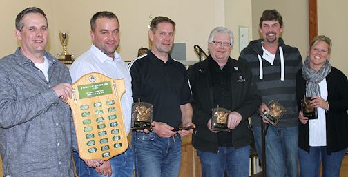 The John Hawrylyshyn award went to Troy Snobelen, Julie Twolan, Bill Rutledge, Mark Vollmer and Kenny Thompson of the Peewee Rep. team. The award recognizes the coaching staff that exhibits outstanding dedication, commitment, sportsmanship and positive contributions to minor hockey. This team's final playoff game in Ripley against Lucknow was end-to-end action. The parking lot was full, and the arena was standing-room only. And the fans were thrilled as the Ripley Novices won in overtime.